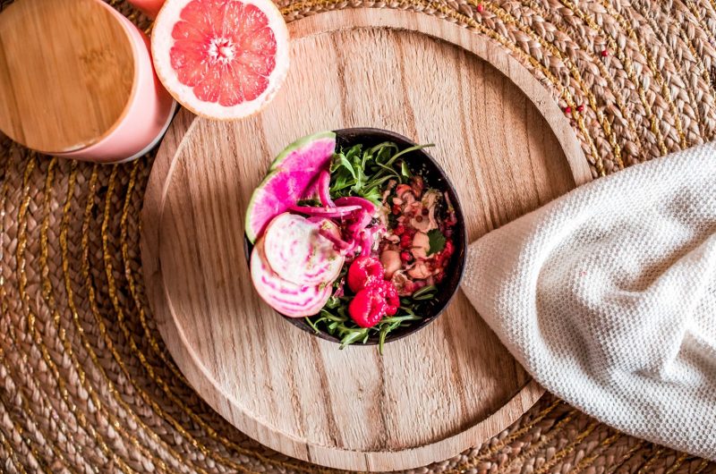 Disposer une poignée de roquette et quelques rondelles de betterave rouge crue et de radis rose
