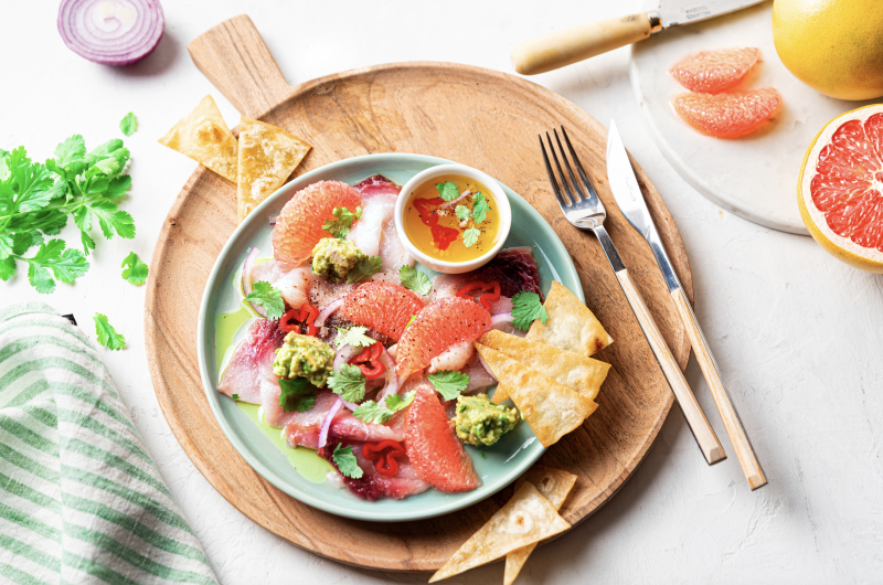 4. Prélevez un quartier de Pamplemousse de Floride pour en récupérer le jus et découpez le Pamplemousse de Floride en suprêmes. Versez-en une partie sur le poisson puis rajoutez les oignons ciselés, 4 cuillères à soupe d’huile d’olive et le piment. Salez et poivrez puis recouvrez d’un film et placez au frigo 10 minutes.