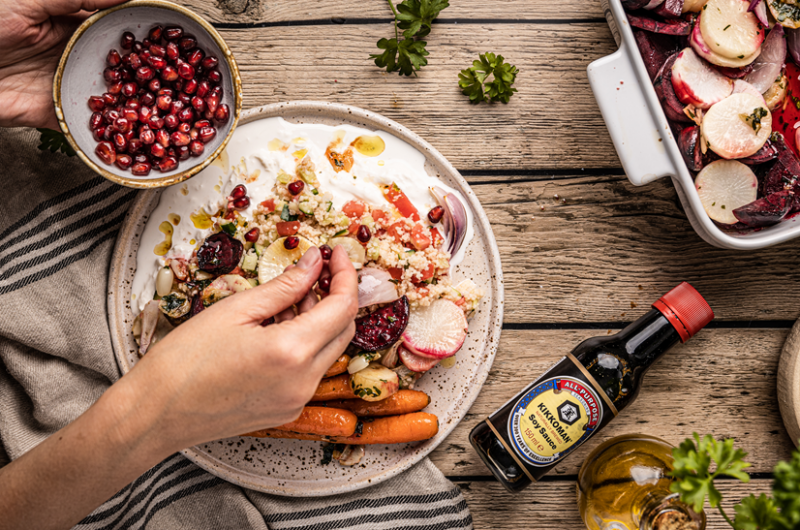 Étape 4 : Placer la burrata sur une assiette, puis la recouvrir de couscous et des légumes rôtis marinés. Arroser le tout avec la marinade restante. Enfin, garnir avec les graines de grenade et les feuilles de persil.