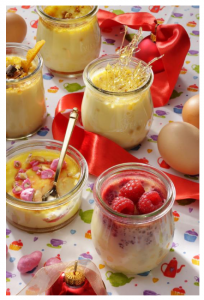 Verser une cuillère à soupe de confiture de framboises à la place du caramel. Ajouter 4 ou 5 framboises fraîches par verrines, puis verser les œufs au lait. Laisser cuire 25 min.