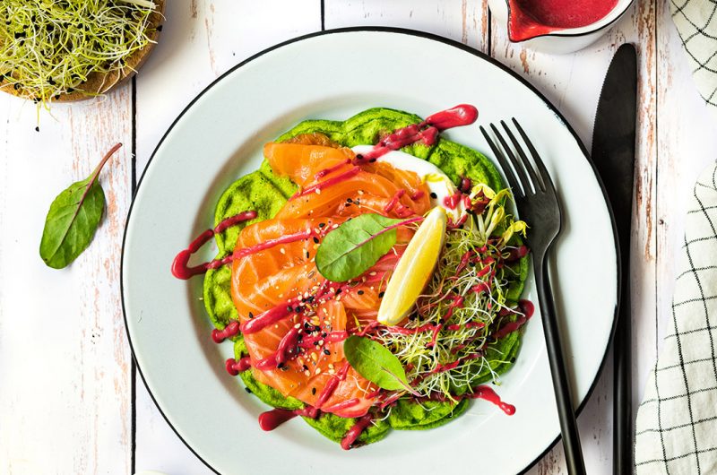 Gaufres vertes au Saumon Fumé & sauce aigre-douce à la betterave
