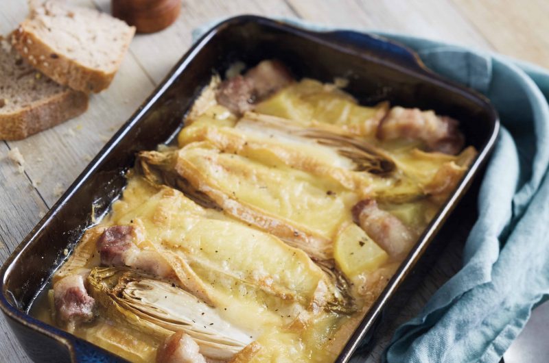 Dans un plat à gratin, disposez les pommes de terre cuites, puis les endives et enfin les lardons et les échalotes. Versez la bière puis ajoutez les tranches de maroilles par-dessus.