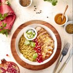 - Dans 2 assiettes creuses, répartir le riz puis le poulet et les grains de grenade.Parsemer de feuilles de coriandre ciselées et servit aussitôt avec le raïta.