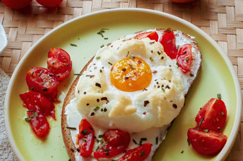 Une fois prêt, déposer l’œuf nuage sur le toast de fromage de frais, ainsi que les tomates cerises, saupoudrer de ciboulette et c’est prêt. Bon appétit