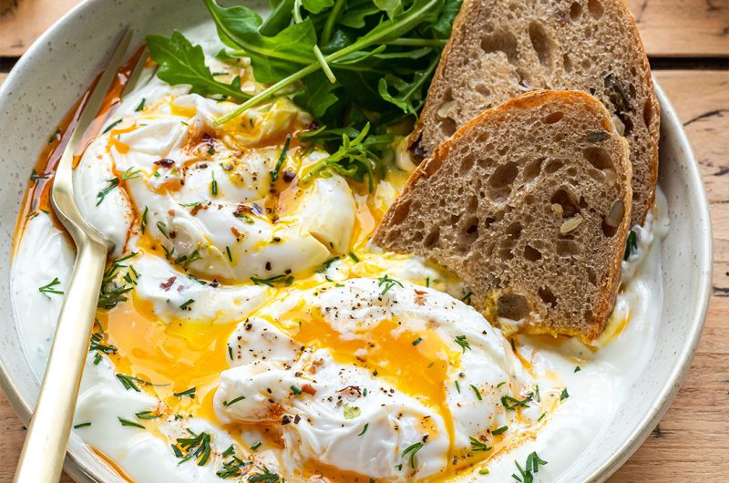 Déposer les œufs sur le fromage blanc, ajouter la sauce, du sel, du poivre et le reste d’aneth fraiche et servir avec du pain grillé.