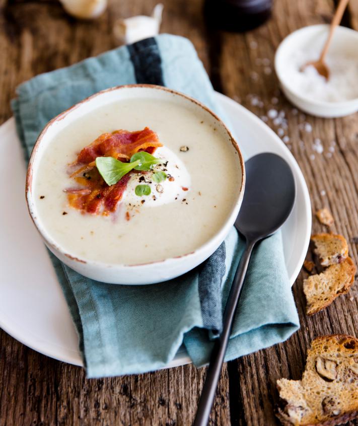4) Serve hot soup on hollow plates and sprinkle with diced Morbier and bread croutons.