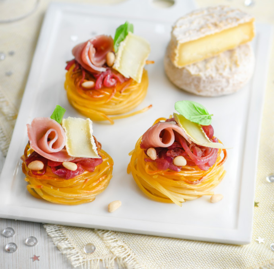 5) Sortez les nids du four et déposez-les sur un plat de service. Une fois tiédis, remplissez-les de compotée d’oignons. Garnissez avec des lanières de jambon, des pignons de pin et une feuille de basilic. Salez, poivrez.
