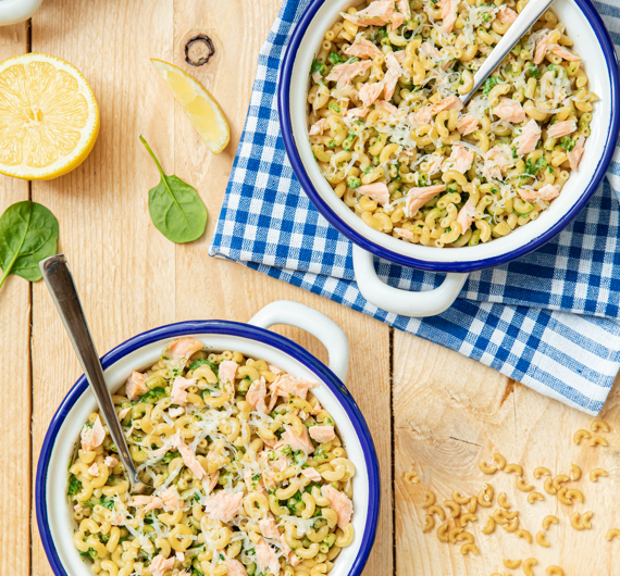 - Servir les coquillettes en les mélangeant à la crème d’épinard et aux miettes de saumon. Râper un peu de gruyère sur chaque assiette, et servir avec un filet de jus de citron. Déguster !