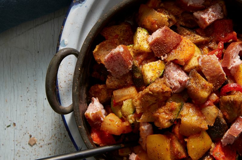 - Couvrir et laisser cuire à petit feu pendant une heure en remuant régulièrement jusqu’à ce que les légumes soient bien confits. Si la préparation s’assèche, rajouter un peu d’eau.