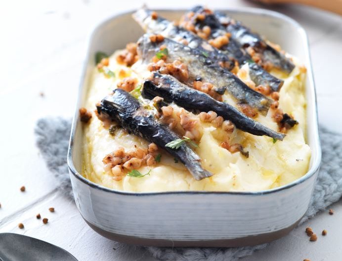 Passer les boîtes de sardines fermées sous l’eau chaude quelques instants pour faciliter le démoulage. Répartir les sardines au-dessus de la purée en les enfonçant bien.