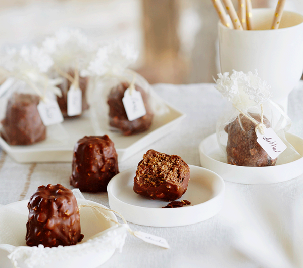 - Démoulez les rochers et piquez-les un à un avec la pointe du couteau à pâtisserie pour les tremper dans le glaçage. Laissez figer sur la toile de cuisson.