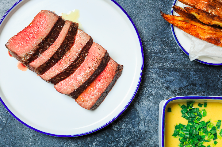 1) Sortir les rumsteaks 45min à l’avance.Sur un grill très chaud, marquer toutes les faces de la viande.Laisser reposer 20min et repasser au four pendant 8min à140°C.