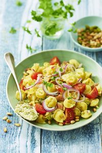 - Dans un bol, mêlez les tomates cerises coupées en deux, ajoutez les herbes, les oignons coupés en petits dés, salez et poivrez. Faites dorer les pignons de pin à sec dans une poêle anti – adhésive. Ajoutez cette préparation au saladier. Bon appétit !