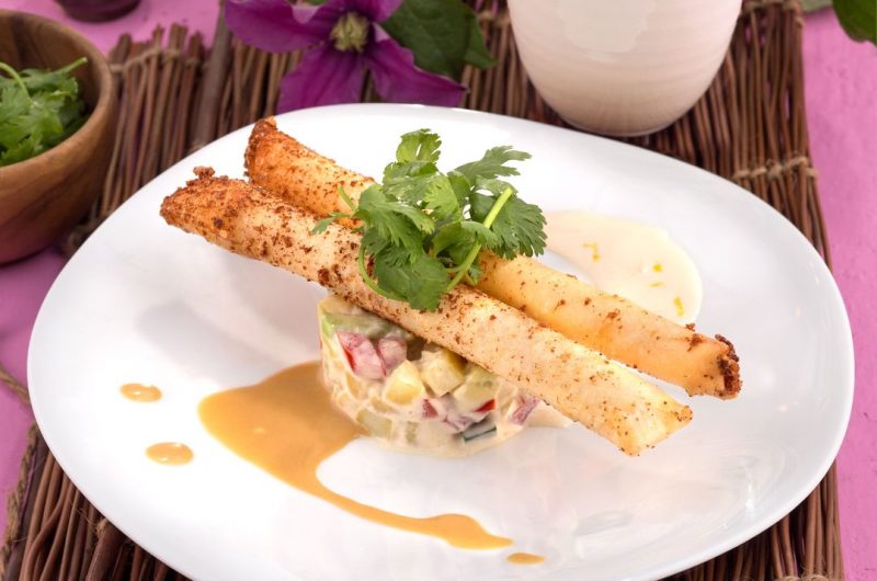 Faire chauffer l’huile à environ 170°C dans une poêle et faire frire les allumettes aux crevettes jusqu’à ce qu’elles soient bien croustillantes. Diluer une petite quantité de mayonnaise au citron avec le lait pour faire une sauce et mélanger avec les ingrédients de la salade.