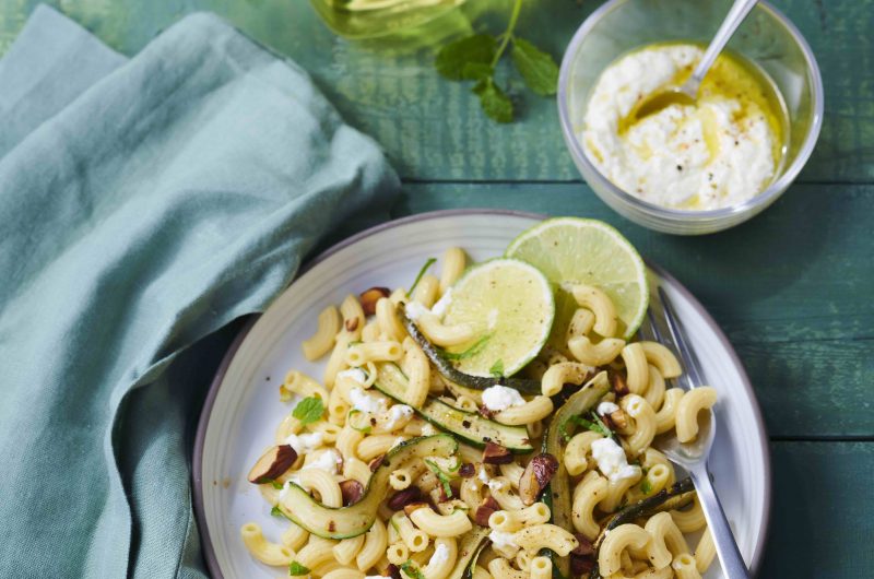 - Dans un grand saladier, mélangez les pâtes aux courgettes, rajoutez la vinaigrette et les amandes grillées.