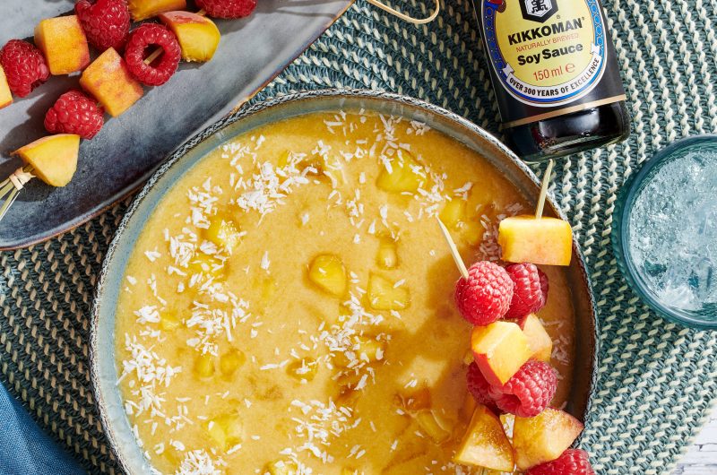 Soupe de fruits d’été délicieusement rafraîchissante à base de pêches aromatiques, de nectar de pêche, de lait de coco, de sauce soja Kikkoman et de jus de citron. Servir glacée et garnie de brochettes de fruits.
