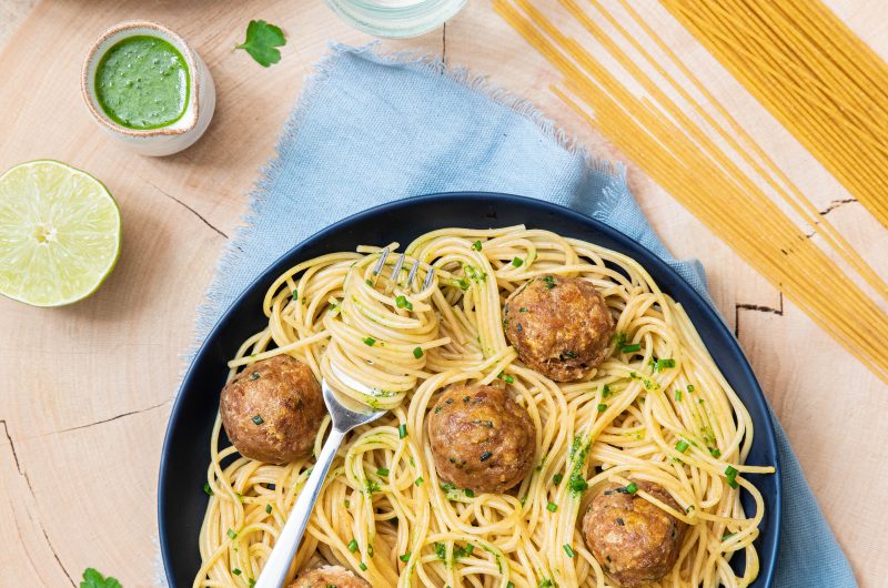 - Servez les spaghetti avec les boulettes en les arrosant de la sauce aromate citronnée. Ajoutez un peu d’aromates ciselés en topping, et dégustez !