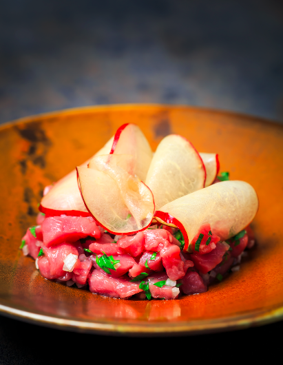 Découvrez le Tartare de veau, asperges vertes et palourdes (Par le Chef Julien Duboué).