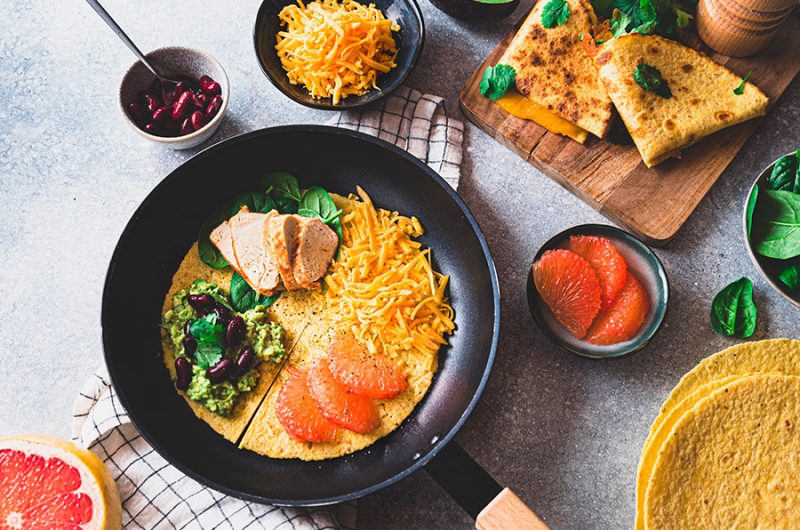 - Sur le deuxième quart, déposez les morceaux de poulet rôti et les pousses d’épinards. Sur le troisième quart rajoutez le cheddar râpé et finissez sur le quatrième quart par les morceaux de pamplemousse.